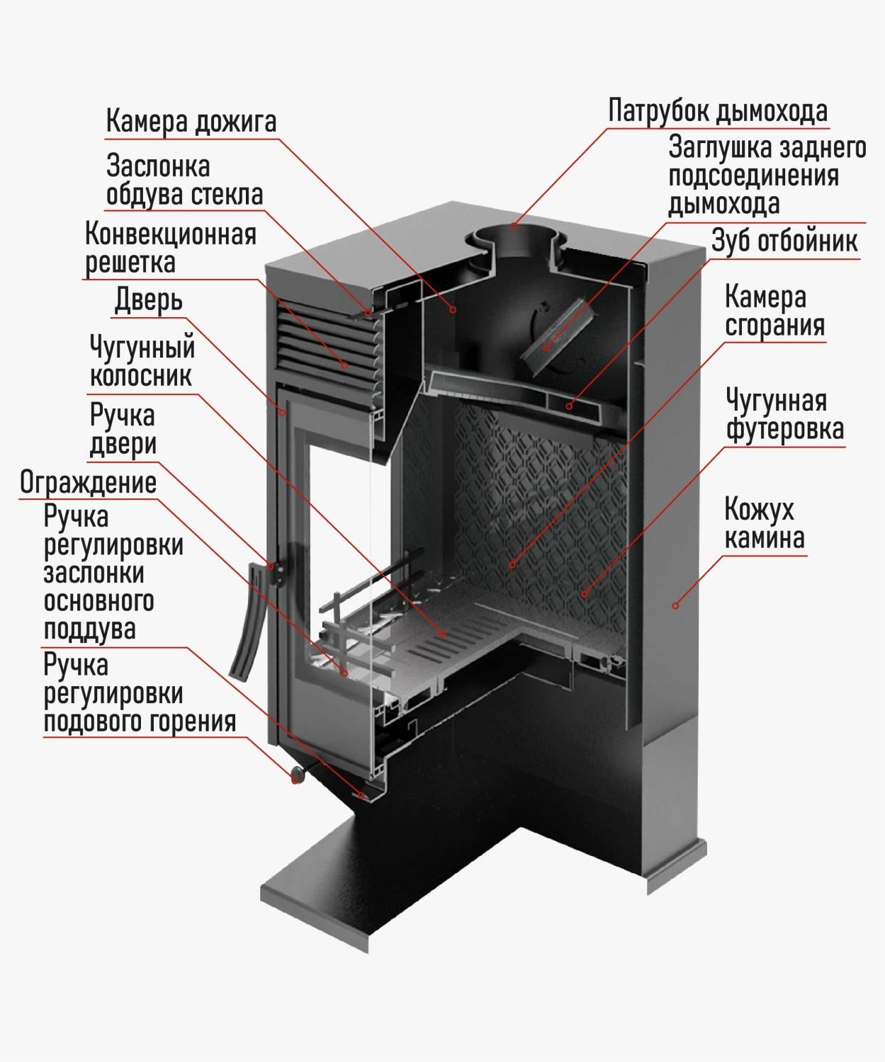 Неоспоримым преимуществом дровяных каминов Black Stove является футеровка из толстостенный чугунных плит имеющих собственный дизайн для каждой модели! Чугун защищает корпус камеры сгорания камина и является мощным теплоаккумулятором сохраняющим тепло продолжительный период! Система конвенционных каналов передаёт полученную энергию в виде тепла для максимально быстрого прогрева отапливаемого помещения!